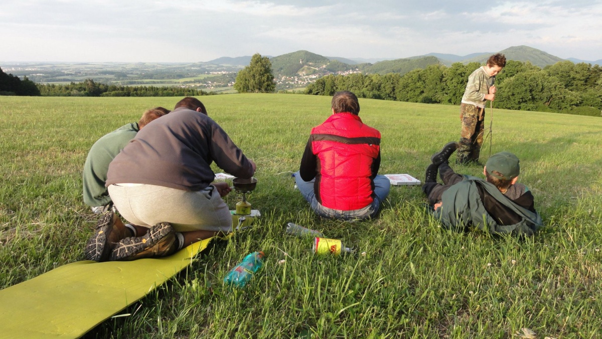 Po dlouhé době výprava jen s batohem a pod stany. Sešli jsme se u klubovny a pěšky vyrazili směr Rybí. po pár kilometrech chůze nás přivedl Dušan na místo s nádherným výhledem na okolí. Utábořili jsme se, postavili stany a užili si dne se spoustou her.